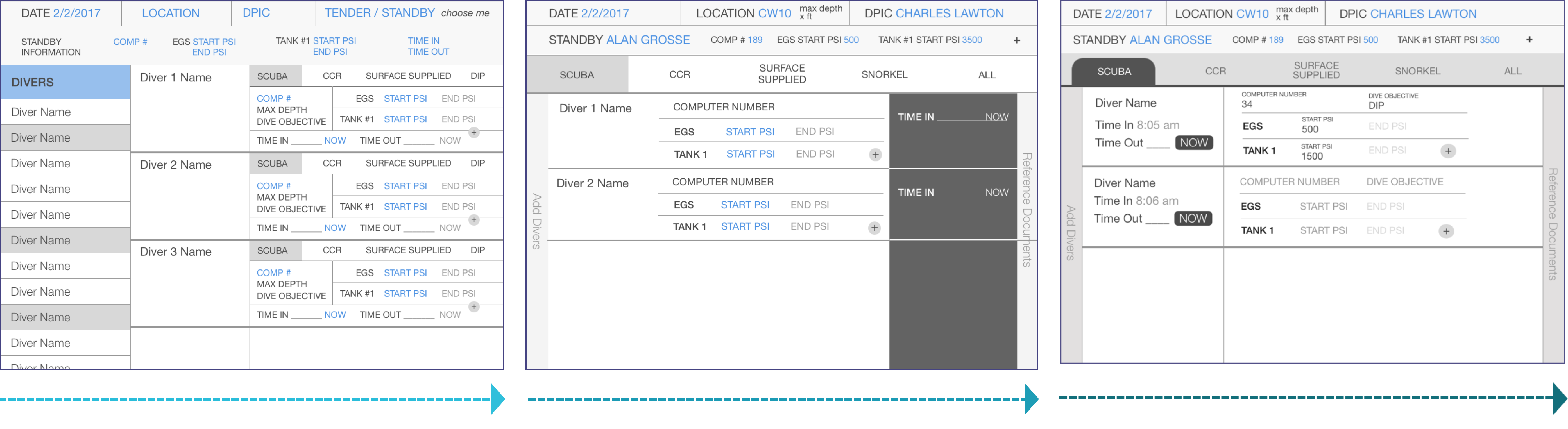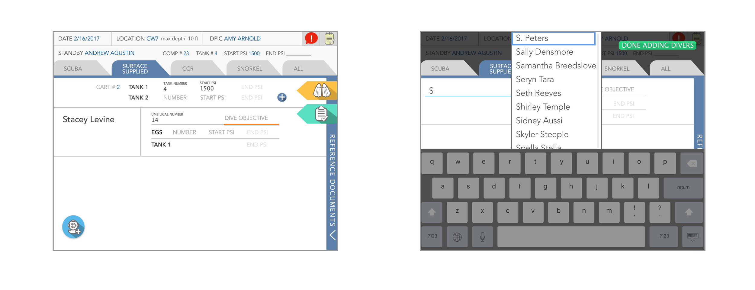 2. Tenders were not accustomed to using the scrolling feature to select diver names, and instead preferred the search and autofill function. Removing left module of scrolling names saved additional space and further streamlined the app, while better matching tenders' workflow.