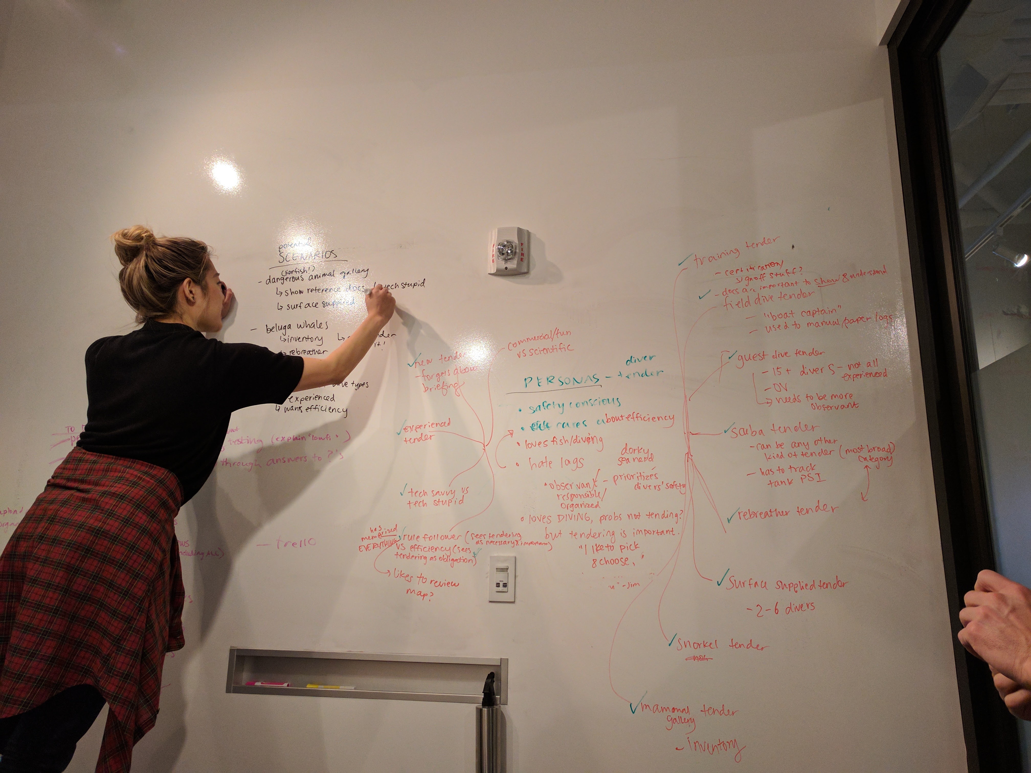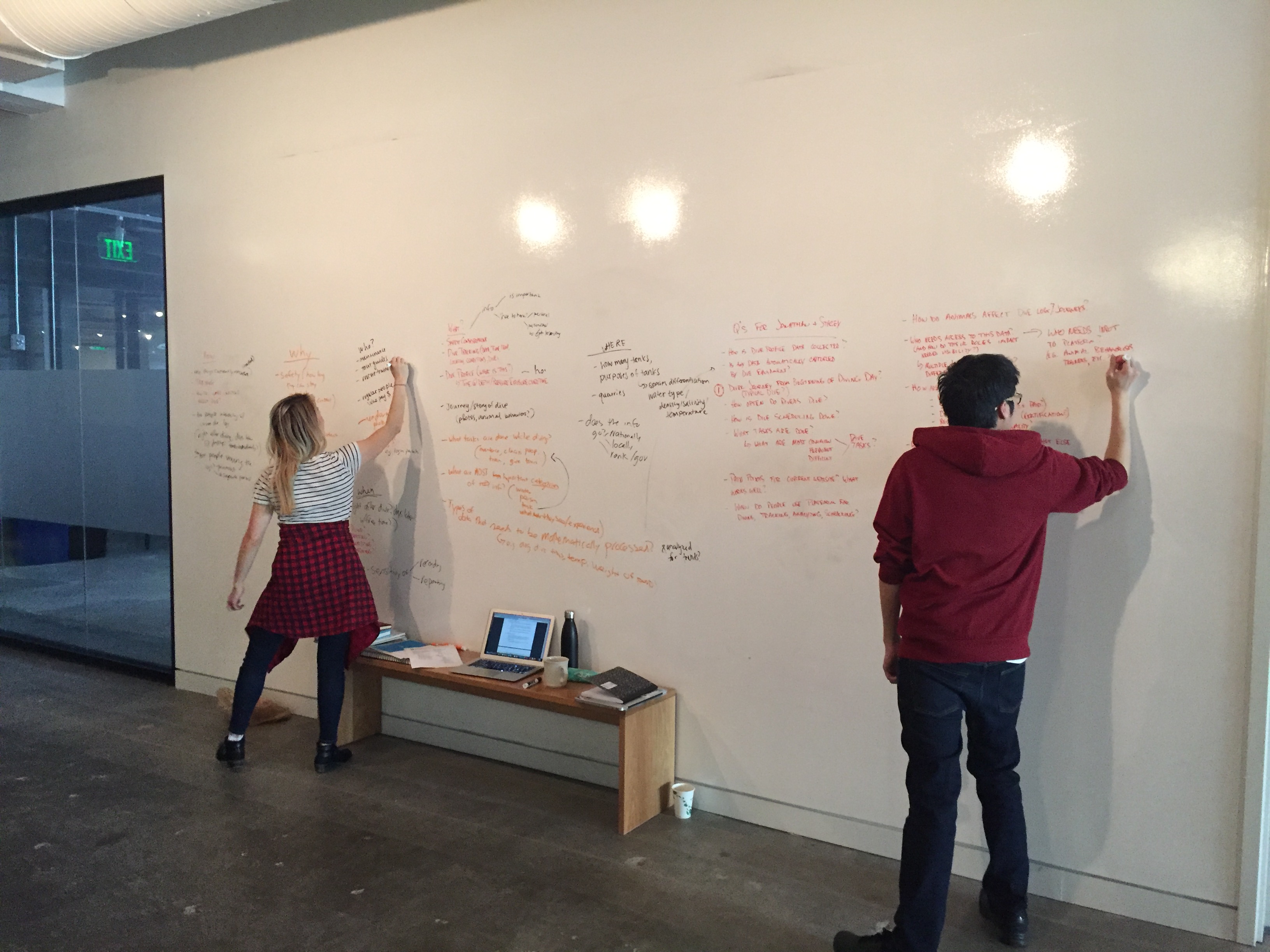 Whiteboarding: We began our brainstorming process by white-boarding all the questions we could come up with that might apply to the dive log process to identify the boundaries of the project. We jokingly called this 'what is water?' to remind us that questions about the basics of diving were as important (if not more so) than anything else at this early stage.