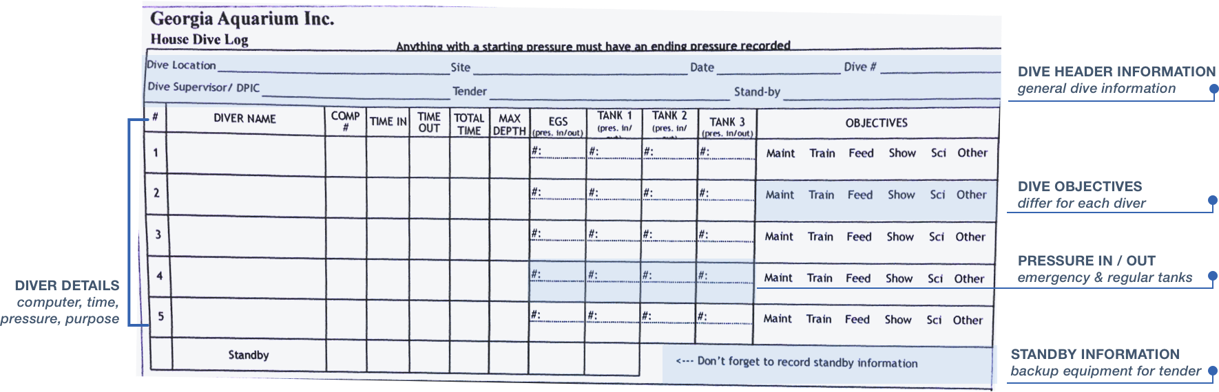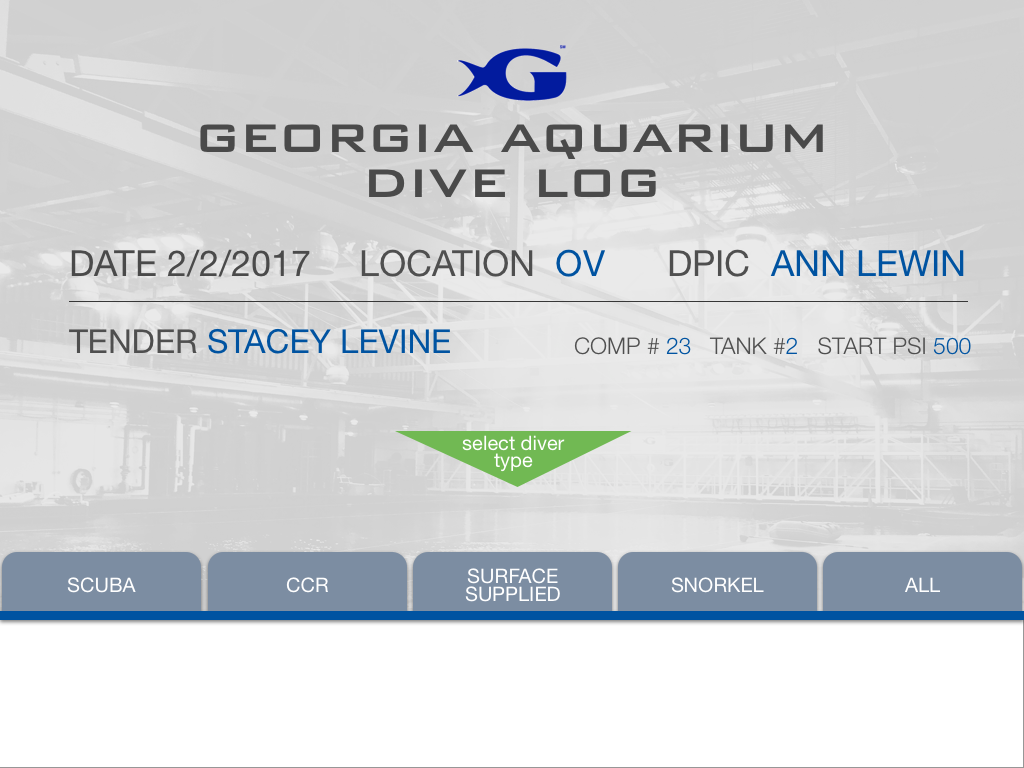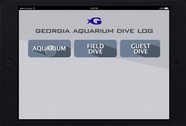 The Dive Ops team at the Georgia Aquarium is responsible for all underwater activities, including fish feeding, tank cleaning, and animal training. Each dive is overseen by a dive tender, someone who's responsible for ensuring divers' safety and recording relevant details from the dive. The tender would have to log this information on paper, which would need to be re-entered through a desktop-based software- all of which could be cumbersome and inconsistent.