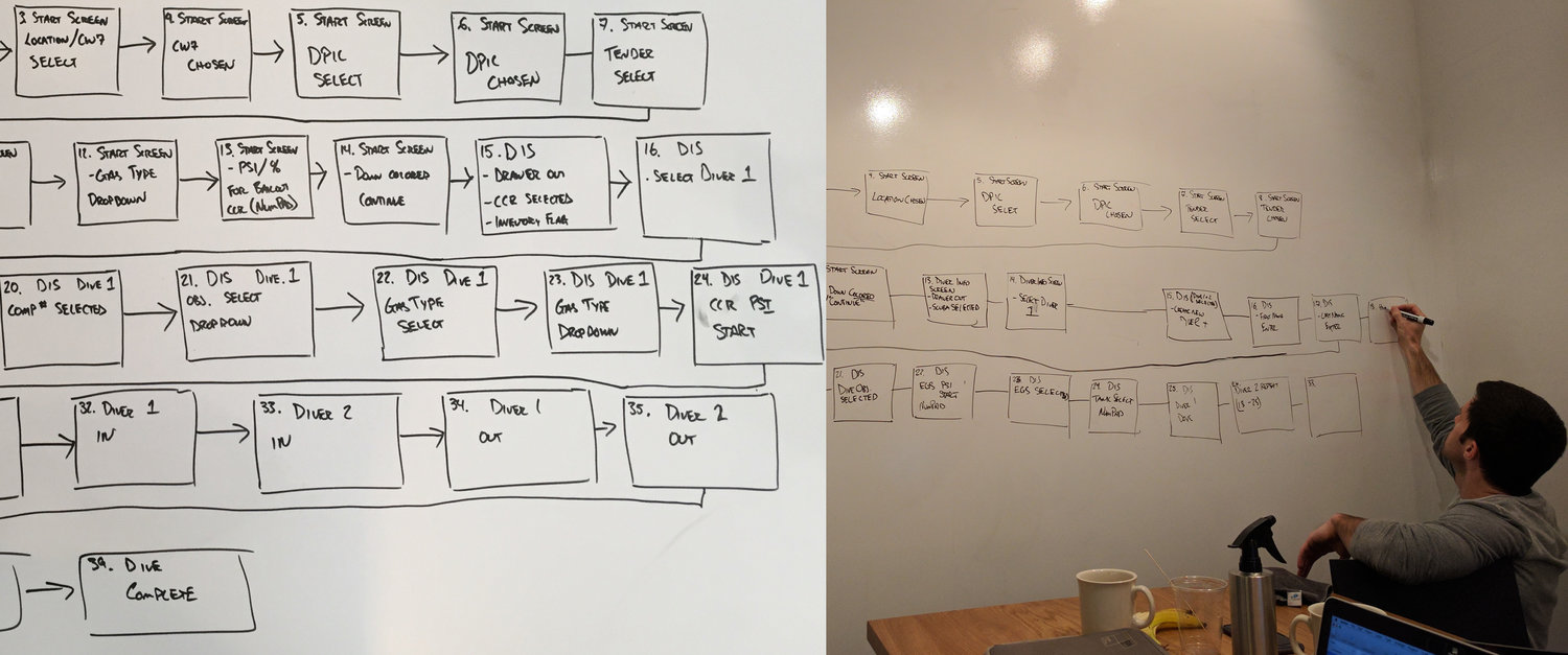 User Flows: And, we built out the user flow and data-entry flow for different dive-type scenarios to ensure that our first iteration prototype would function according to the tender workflow.