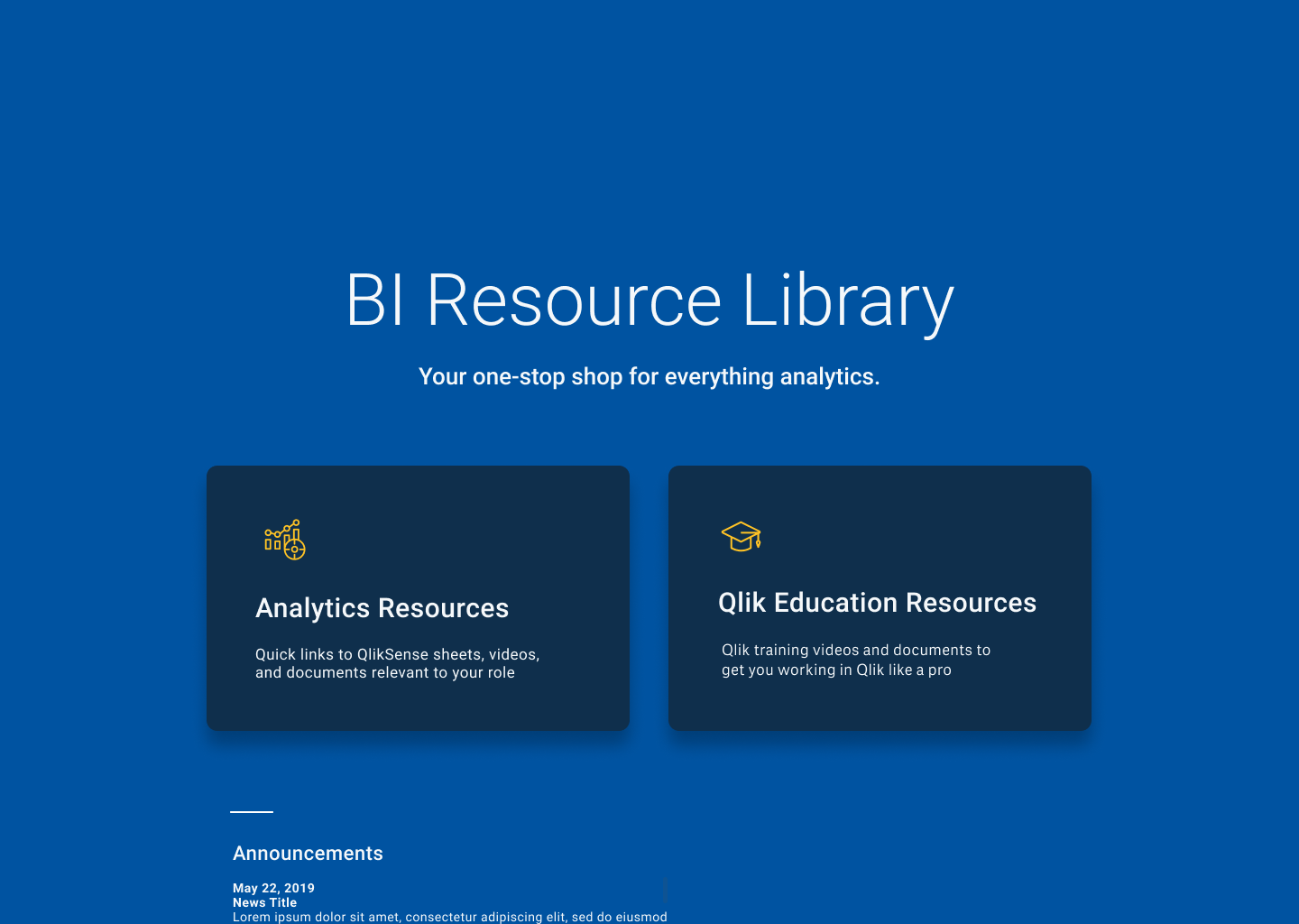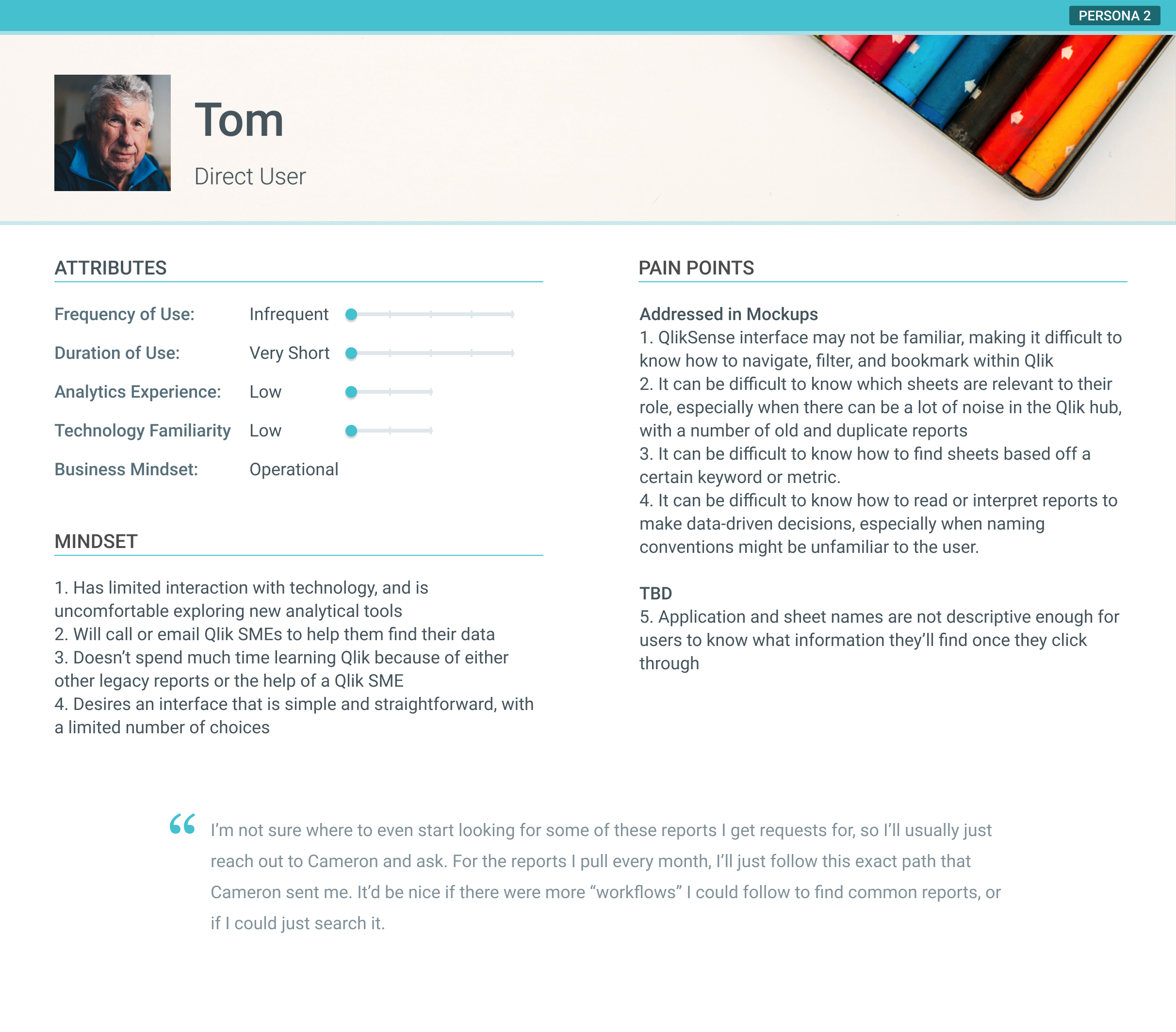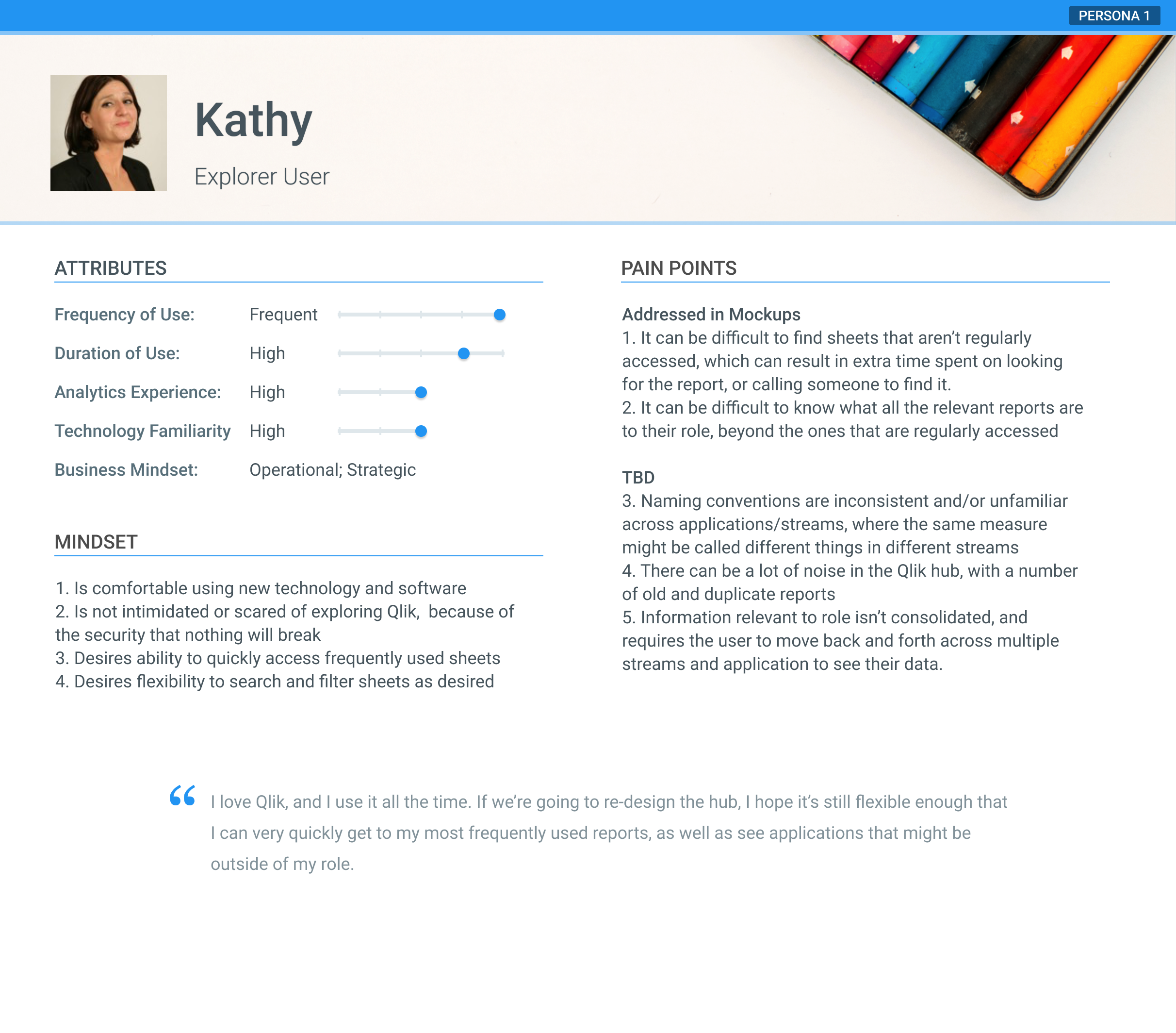 Two main personas came out of the research: the "direct user," or someone who wants a straightforward interface that enables quick access to a set list of reports, and the "explorer," or someone who wants flexibility to explore and discover the library. Something to note about the "direct user" is that they often may not understand how to use the Qlik interface to begin with, and would likely need easy-to-access education resources to get started.