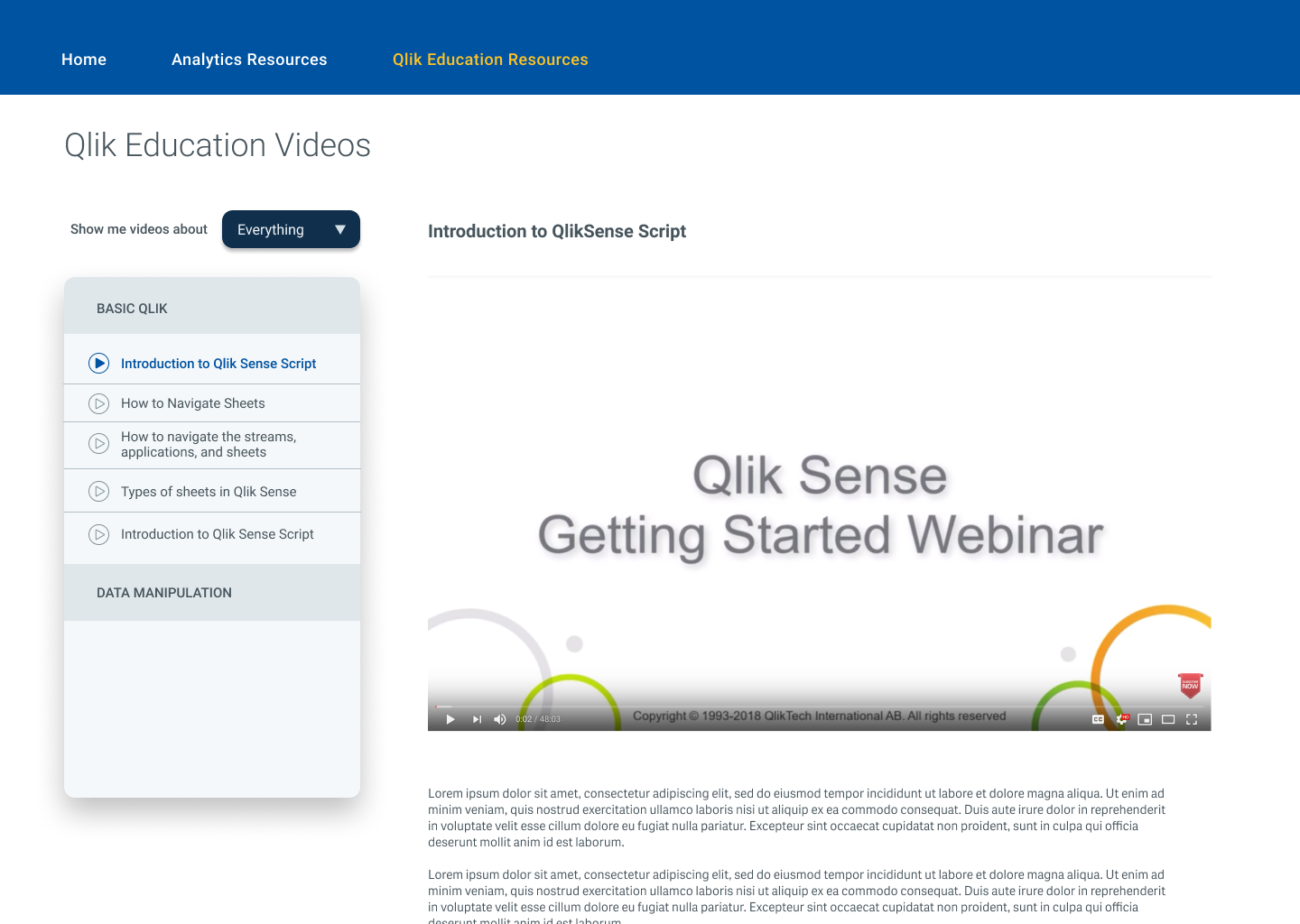 The Analytics Resources page is familiar to a google search page, with quick filters to narrow the list down to role, operation area, subject area, etc.