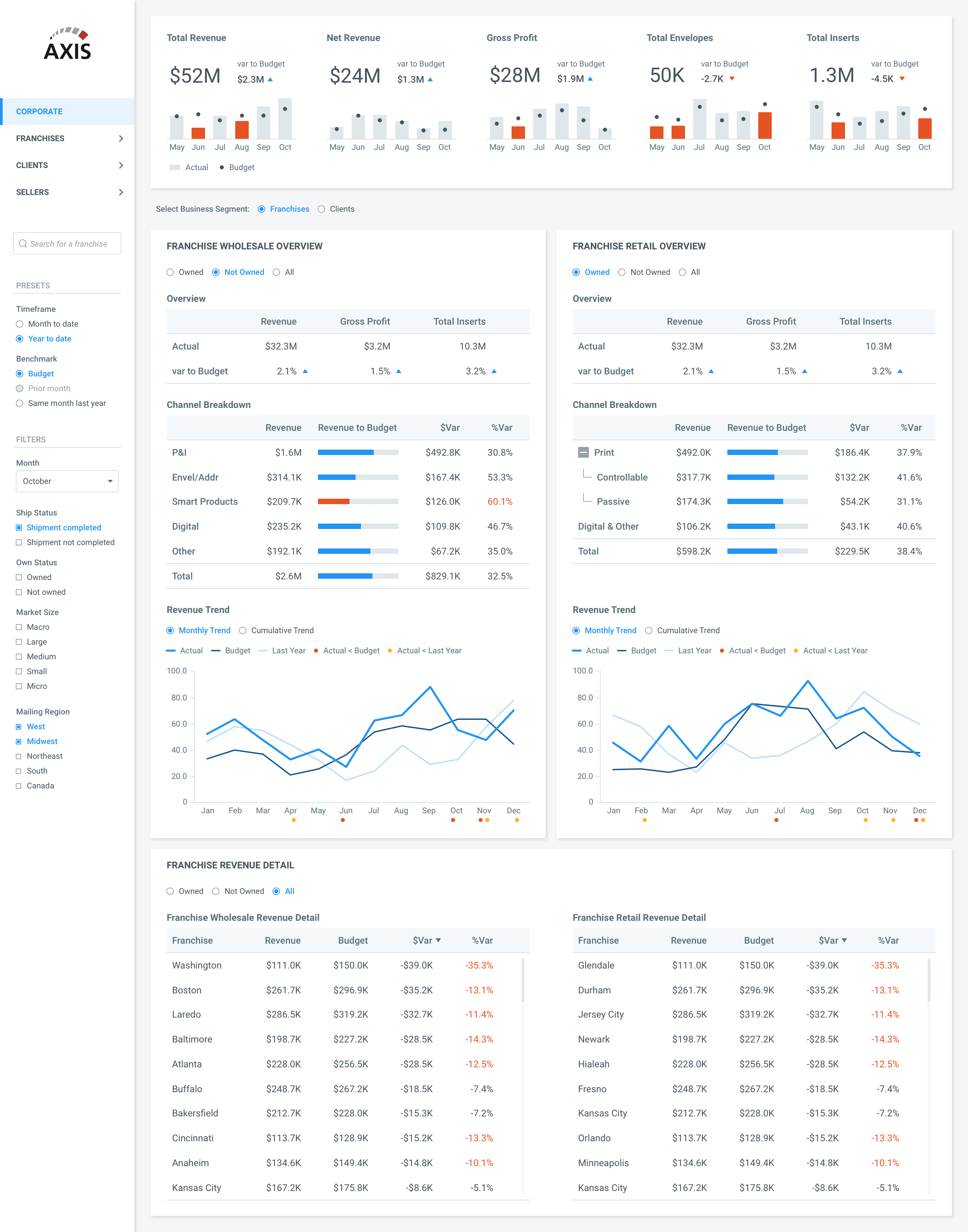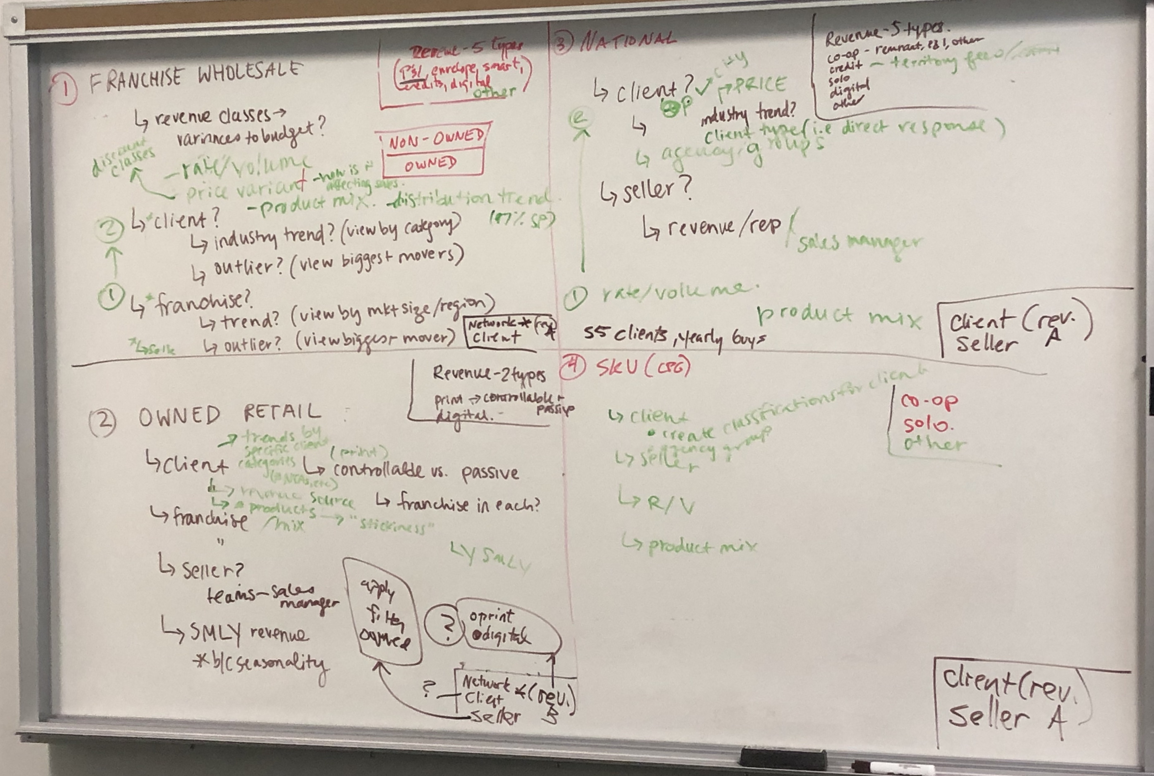 Because executive leadership needed to get a pulse on all of their business segments, from wholesale to retail, owned to not owned, we had to map out how these different segments fit together, and what flow of dimensions made sense to display from the executive viewpoint.